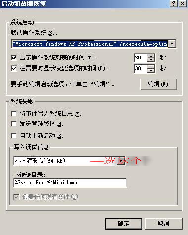 选好后点确定,下次再出现蓝屏时,系统就会存储下dump文件,一般存放位置在系统盘的minidump文件夹下。(建议在该文件夹上点右键——属性——发送到——桌面快捷方式,以后就能在桌面上找到该文件夹了)