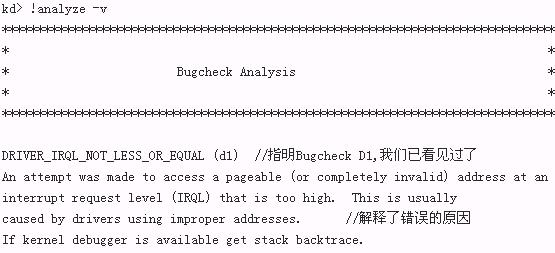 导入dump文件分析完毕后,不要关闭,在后面输入 !analyze -v ,这个命令可以查看dump文件的详细情况,如图: