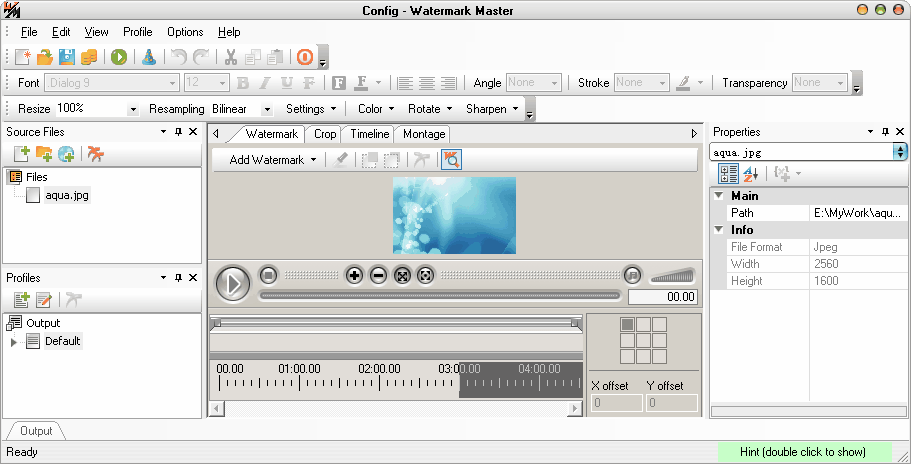 基本上,有8步骤,增加了水印:添加源文件,选择一般输出设置(配置文件,输出格式,版权) ,设置格式的输出文件,并指定参数的图像采集。下一步,您可以选择过滤器,如果您需要任何的和定制的水印。您选择类型的水印,位置等情况下,您要添加文字水印,您可以选择字体,颜色,对齐等在所有的设置已经确定,该计划将执行选定的行动。