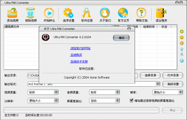 Ultra RM Converter 是一款可以帮助你将RM, RMVB分割、结合、转换成AVI, MPEG, VCD, SVCD, DVD, WMV 文件的软件。使用它,你能够将 RealMedia(*.RM,*.RMVB) 文件转换到 AVI(Divx,XviD,MPEG4), MPEG1, MPEG2, VCD, SVCD, DVD, WMV/ASF 文件。还可将一些小尺寸的 RealMedia 文件加以结合成一个文件,也可以将一部大尺寸的 RealMedia 文件分割成数个小尺寸的文件。