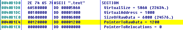 .text区段的PointerToRawData怎么会是1200??应该是1000啊,因为PE头占了1000字节