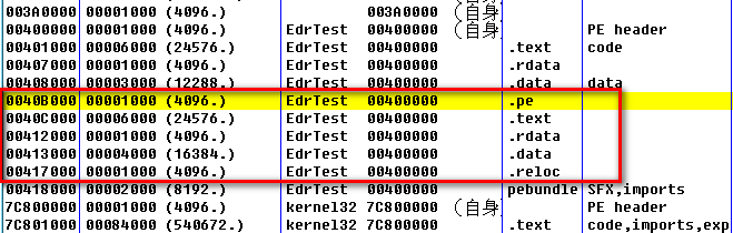 如图,大家看到了那些区段了吧,呵呵!这个壳很有意思,把DLL的所有区段,连名称都没变,就直接捆绑到主程序的区段里了!