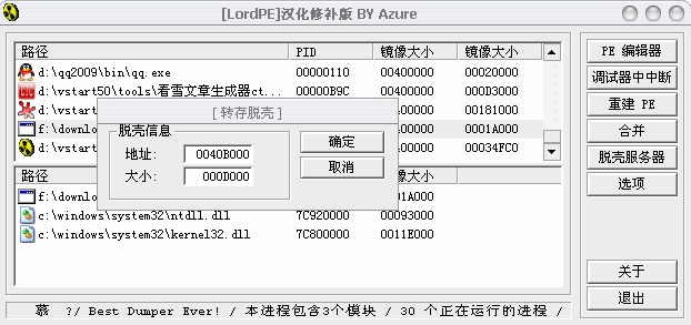好了,我们也不先运行了,直接DUMP吧,用LoadPE的部分Dump功能,地址填写:0040B000,大小是C000,大家可以自己累加一下!