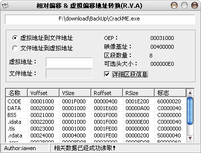 发布于2009年3月2日-0001年11月30日 由iawen自己写的一个相对地址与虚拟地址的转换工具 修改了一下,增加了对附加数据的判断!看了一个星期的PE格式,花了点时间写了这个工具以加深对PE结构的印象。仿着一个现成的工具做的,呵呵!想试试的,就下载着玩吧! 等自己有空测试一翻后,再放源码吧!程序运行界面如下: [color=#FF0000][2009-3-2 23:28] 更新了一处计算文件偏移到虚拟地址的转换错误[/color]RVA.rar
