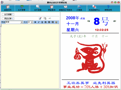 这是一款绿色软件,无须安装直接运行。主要功能是管理名片(或通讯录),附加功能有桌面日历、便签记事、生日提醒、邮编及区号查询、计算器等。