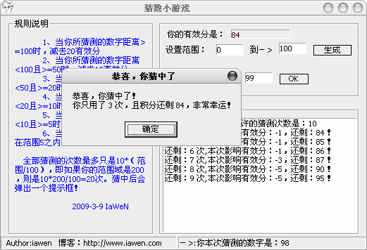 全部猜测的次数最多只是10*(范围/100),即如果你的范围域是200,则是10*200/100=20次。猜中后会弹出一个提示框!\r\n\r\n\