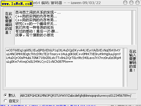 今天有空,完善了一下博客的模块,不过好多都是.blog的安装包,里面的代码都是Base64加密的,不能修改,只好在网上搜索了一下Base64编码、解码方面的小工具。GG搜索了一下,出来一大堆,都还不错。于是修改了一下自己需要的,然后重新加密,完善了博客。