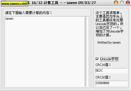 发布于2009年3月27日-0001年11月30日 由iawenCRC 16/32计算工具 如工具上面所介绍的,计算CRC值的工具很多。但是我手头上却找不到对Unicode字符的支持,所以自己写了一个,增加了对Unicode的支持,程序运行后如下图(如处理的字符是Unicode格式,请选中Unicode选项): CRC.rar