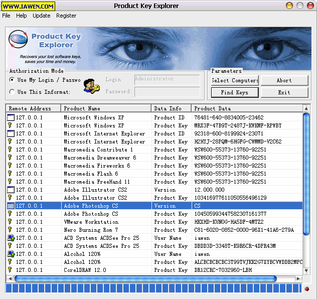 程序密钥显示工具,可以查看电脑中已经安装的程序所适用的密钥或序列号,支持 Windows、Office、SQL 等超过 100 种程序,同时也可以查看远程电脑中的注册信息.