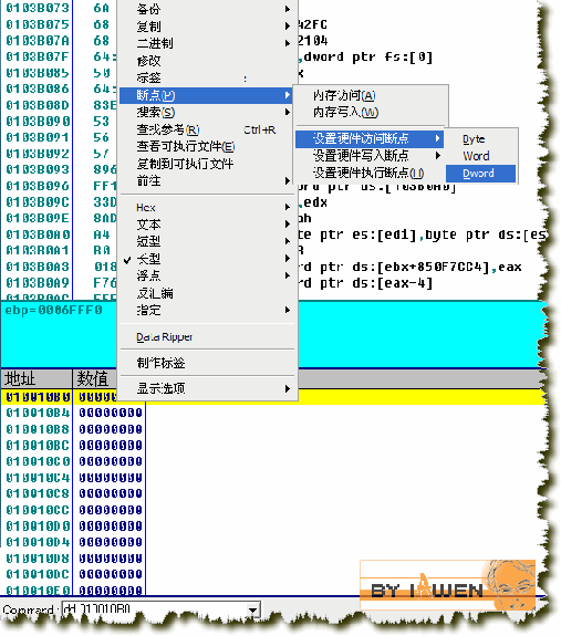 重新载入程序后,我们在010010B0上下“断点--硬件访问断点--DWORD”,如下图:
