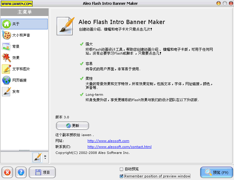 软件主页:[url=http://www.aleosoft.com/flash-intro-banner-maker/index.html]http://www.aleosoft.com/flash-intro-banner-maker/index.html[/url]
