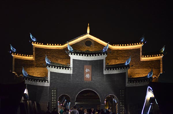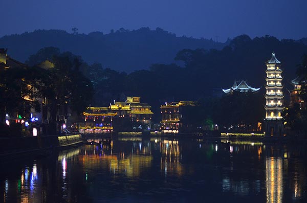 夜晚的凤凰,是绚丽的。虹桥上灯光璀璨,倒映到沱江中,让人迷醉。小巷里的酒吧,游人如簇,沉浸到了这夜色之中。