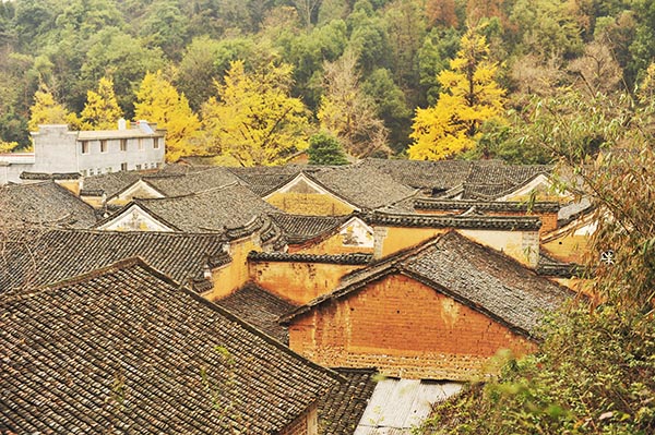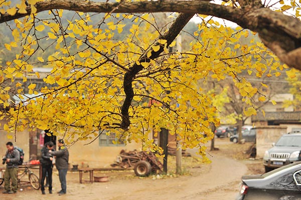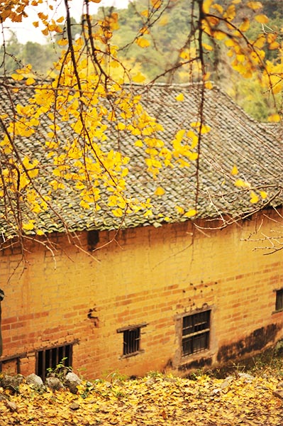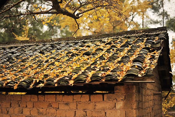 在古朴的村落,银杏洒落四处。风过,一地璀璨,满地尽披黄金甲,映着青砖瓦房,情趣别生。