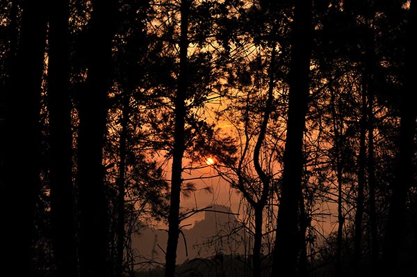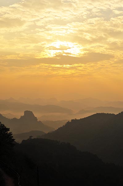 早晨5:00起床,6:30赶到山脚,开始登巴寨山。山虽不高,但当我们走到山腰时,红日已悬挂天空,只能从树隙间领略那红日的风情。