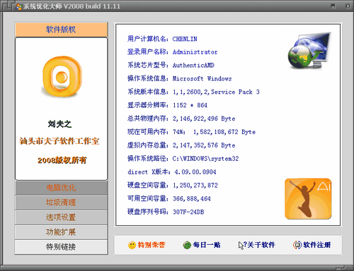 系统优化大师软件全方位、高效、安全地提高你的系统性能,软件使用简单,傻瓜式操作,使用本软件可能迅速达到系统优化目的。包括桌面优化、菜单优化、网络优化、软件优化、系统优化以及禁用设置、选择设置、更改设置等一系列个性化优化及设置选项。软件可以进行高速的注册表清理及高速的硬盘垃圾文件清理,清理全面、安全、不影响任何运行性能。